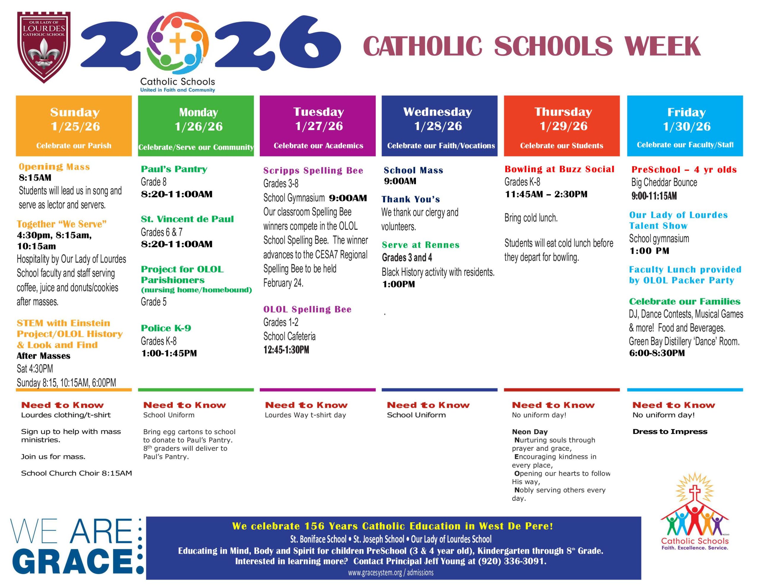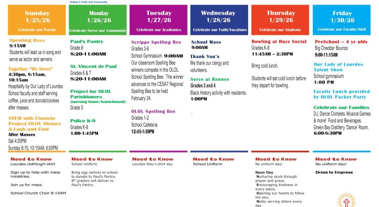 Checkout the many events that are scheduled for this week as we recognize those who support Catholic Education – Parishioners, School Families and Friends of Lourdes, Students, Faculty, School and Parish Staff and our Religious community (St. Norbert Abbey and the Diocese of Green Bay).