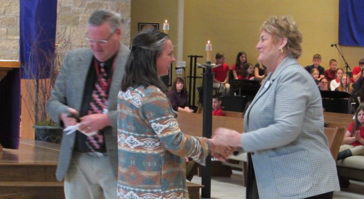 Today, Mrs. Megan Lehmann was recognized as Our Lady of Lourdes Catholic School’s outstanding volunteer during our school mass at Our Lady of Lourdes Catholic Church.